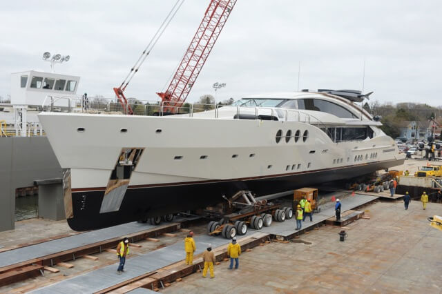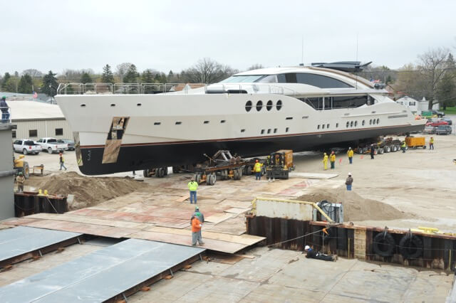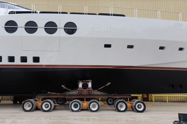 The move began with two full days of preparation that included completing the bolster and cradle system that had been engineered and fabricated by HMR Supplies.  Once the yacht was securely nestled into the bolster system, the dollies that ultimately carried the superyacht onto the barge were put into position. The move ended after an 8-hour session that required the removal of the doorway header within the fabrication facility due to only three inches of clearance for height and navigation of a 90-degree turn in tight quarters.