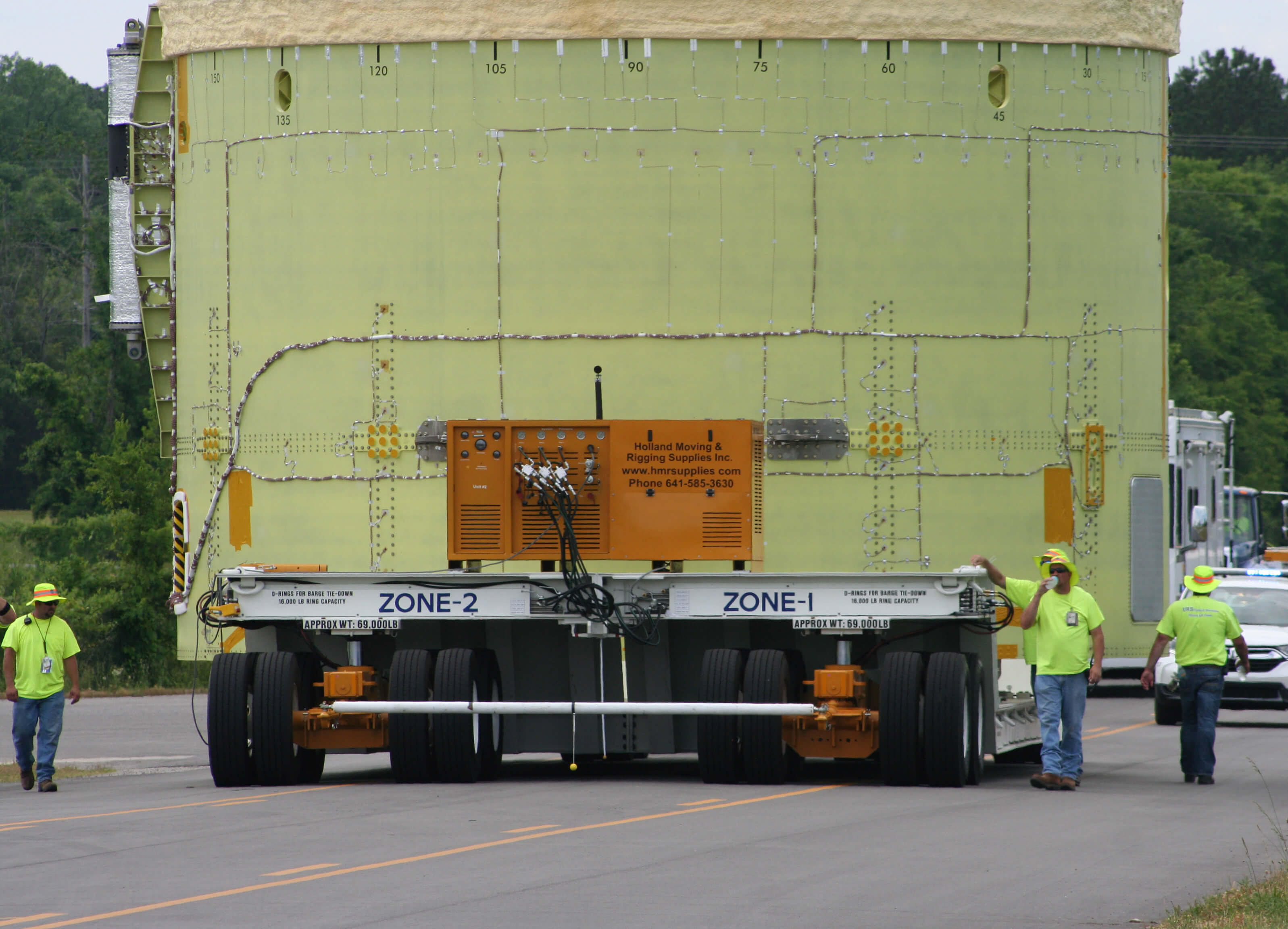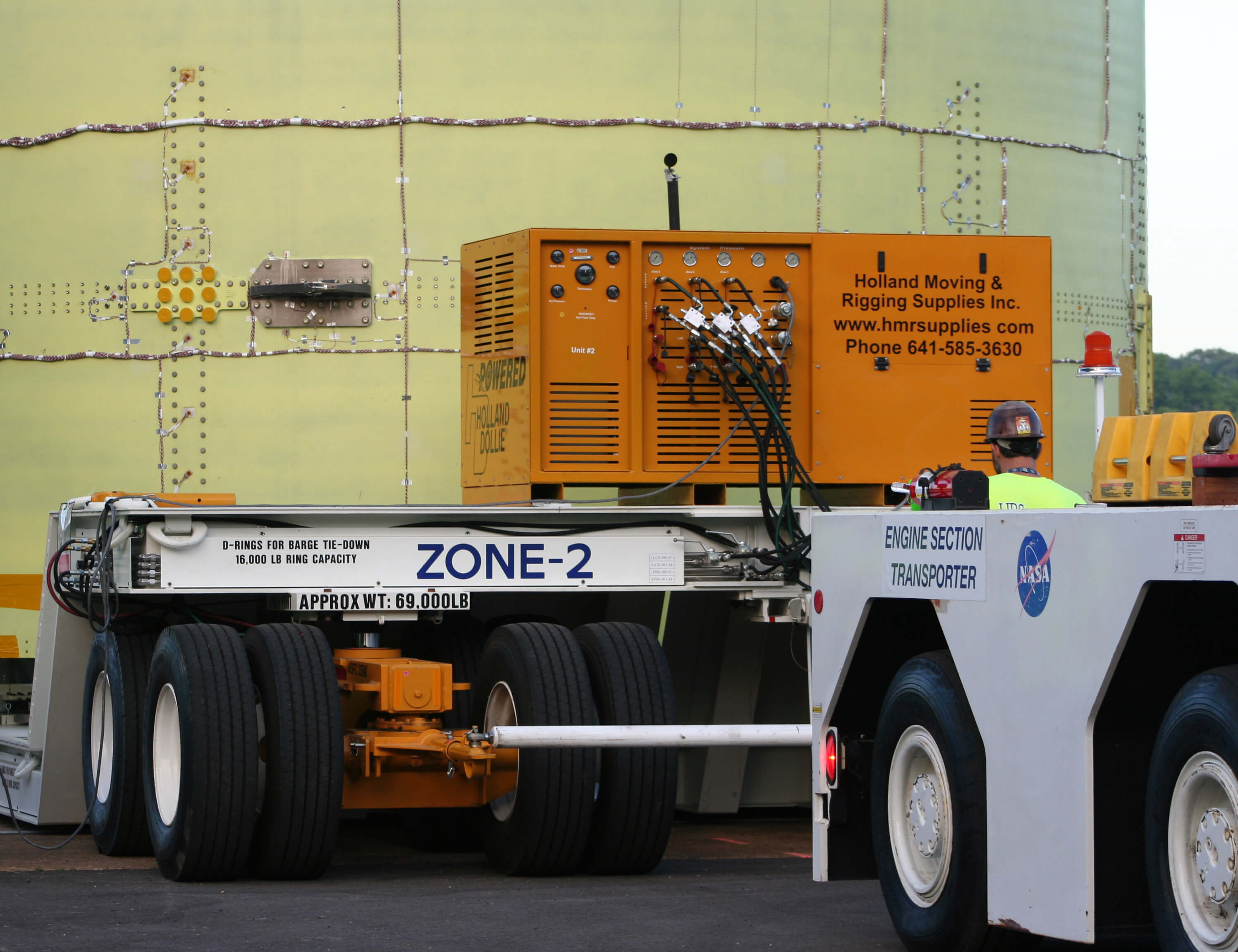 Our most recent project required HMR Supplies to mobilize an engine section for transport of NASA’s new rocket. Four 55T Holland Dollies and a Holland power unit were used to safely transport the engine. The engine section was loaded onto a barge at the Michoud Assembly Facility in New Orleans then traveled 1,240 miles by river to NASA’s Marshall Space Flight Center in Huntsville, Alabama.
