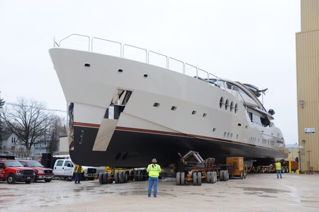 The move began with two full days of preparation that included completing the bolster and cradle system that had been engineered and fabricated by HMR Supplies.  Once the yacht was securely nestled into the bolster system, the dollies that ultimately carried the superyacht onto the barge were put into position. The move ended after an 8-hour session that required the removal of the doorway header within the fabrication facility due to only three inches of clearance for height and navigation of a 90-degree turn in tight quarters.